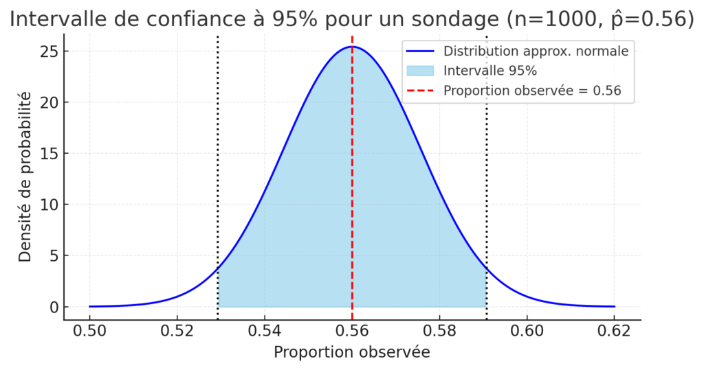 Cela veut dire que la proportion mesurée dans un sondage peut naturellement varier de ±1,6% autour de la vraie valeur, uniquement à cause du hasard d’échantillonnage.