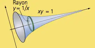 L’idée intuitive est donc celle d’un solide infini en longueur, puisqu’il se prolonge sans limite, mais dont les dimensions transversales (la hauteur [math]1/x[/math]) deviennent de plus en plus petites.