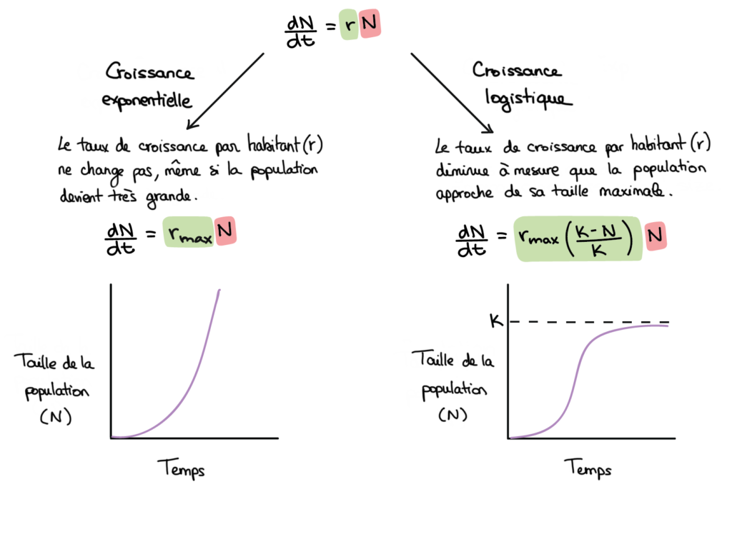 Pour tenir compte de cette réalité, on utilise le modèle logistique, qui ajoute une borne maximale [math]K[/math] correspondant à la taille totale de la population.