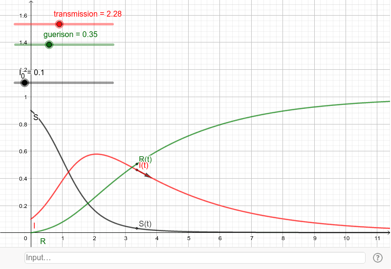 • Si [math]\beta = 0{,}3[/math] et [math]\gamma = 0{,}1[/math], alors [math]R_0 = 3[/math]. Cela signifie qu’un malade contamine en moyenne 3 autres personnes → épidémie explosive.