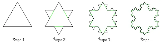 À l’étape n → n+1, sur chaque côté de longueur [math]l_n[/math], on ajoute un petit triangle équilatéral dont le côté est le tiers du côté de départ, donc [math]\tfrac{l_n}{3}[/math].