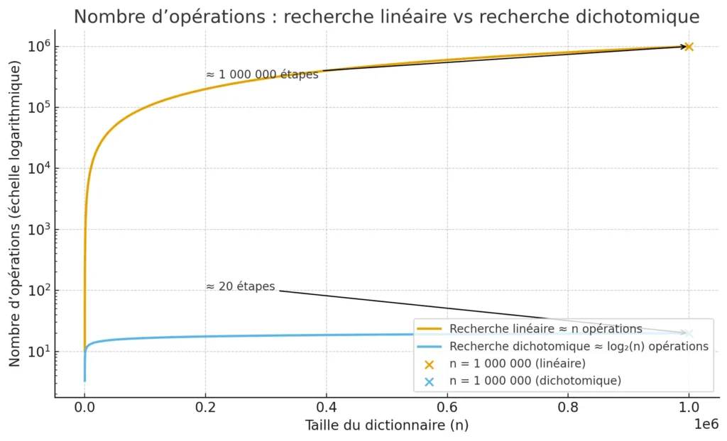 Autrement dit, 20 étapes suffisent pour retrouver un mot parmi un million. Sans logarithmes, il faudrait imaginer parcourir tout le dictionnaire, soit un million d’opérations.