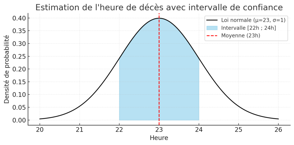 Ainsi, au lieu d’annoncer une seule valeur (« mort à 23 h »), les experts peuvent dire : « avec 68 % de probabilité, le décès a eu lieu entre 22 h et minuit ».