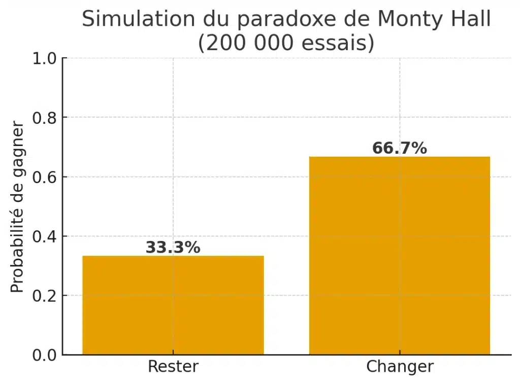 Intuitivement, beaucoup pensent que changer ou non revient au même (50% de chance). Mais en réalité, les mathématiques montrent que changer double les chances de gagner. C’est le fameux paradoxe de Monty Hall.
